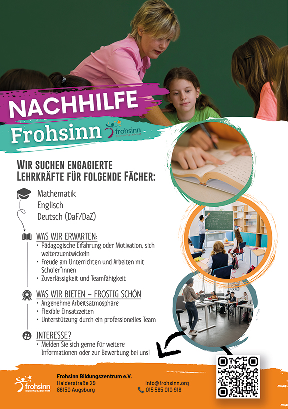 Arbeitest du gerne mit Kindern und Jugendlichen? Hast du Spaß daran, dein Wissen weiterzugeben und Schüler:innen auf ihrem Lernweg zu begleiten? Dann freuen wir uns, dich im Team des Frohsinn Bildunszentrum willkommen zu heißen!